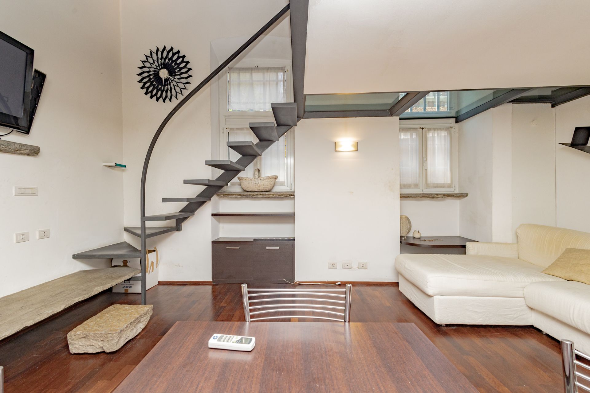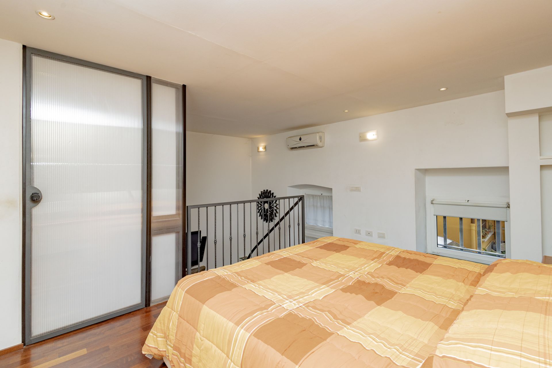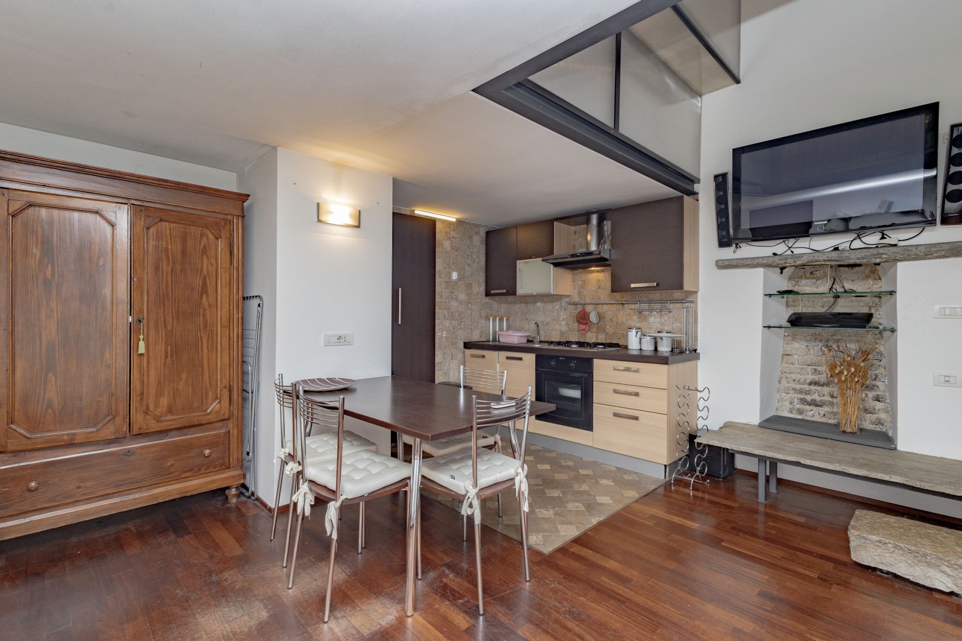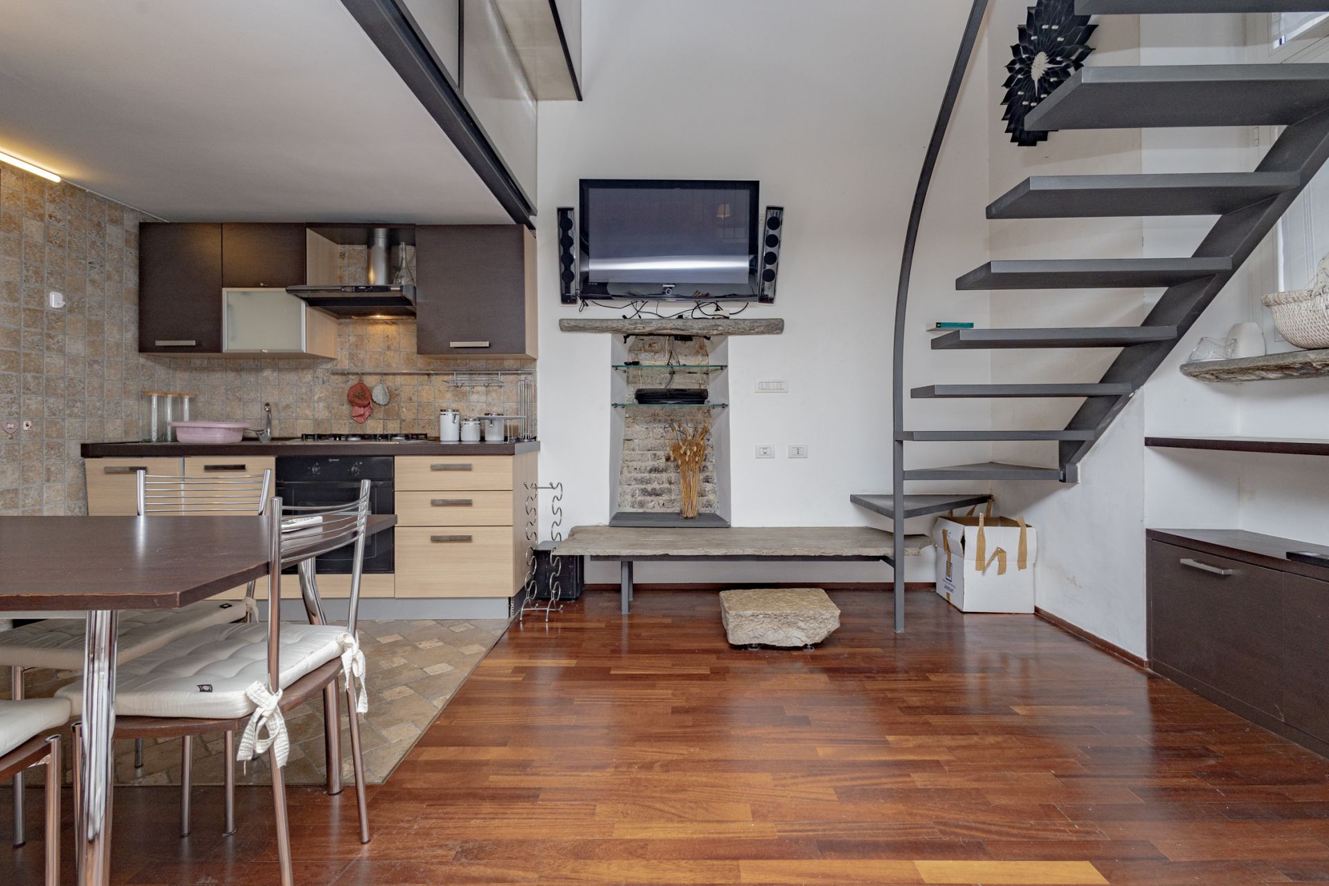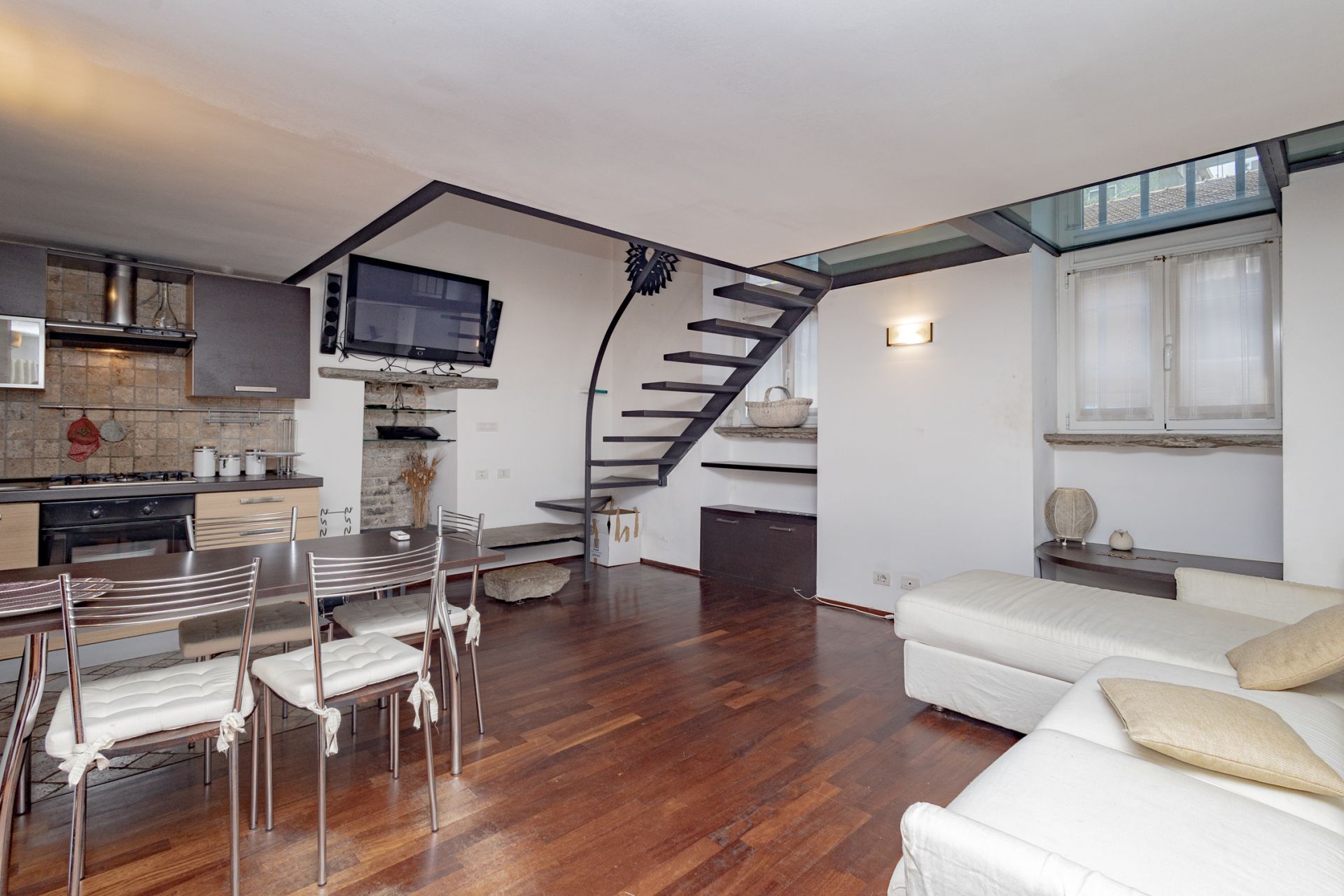 L’ingresso si apre sull’ampio soggiorno con cucina a vista, completamente attrezzata con piano cottura a gas e lavastoviglie. Una scala interna conduce al soppalco, dove sono collocati la camera matrimoniale e il bagno, pensati per sfruttare al meglio l’altezza degli ambienti e creare un’atmosfera intima e caratteristica.