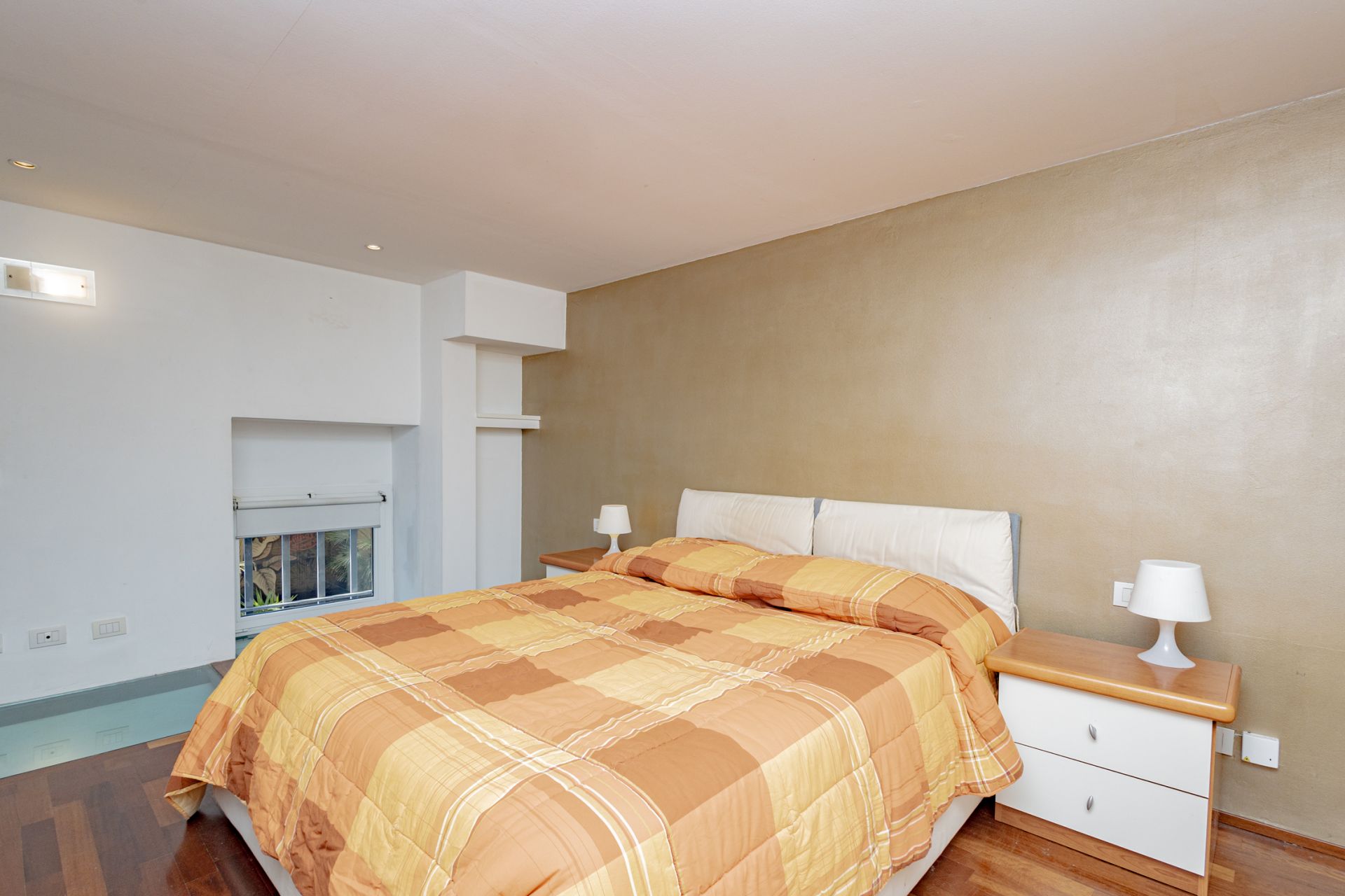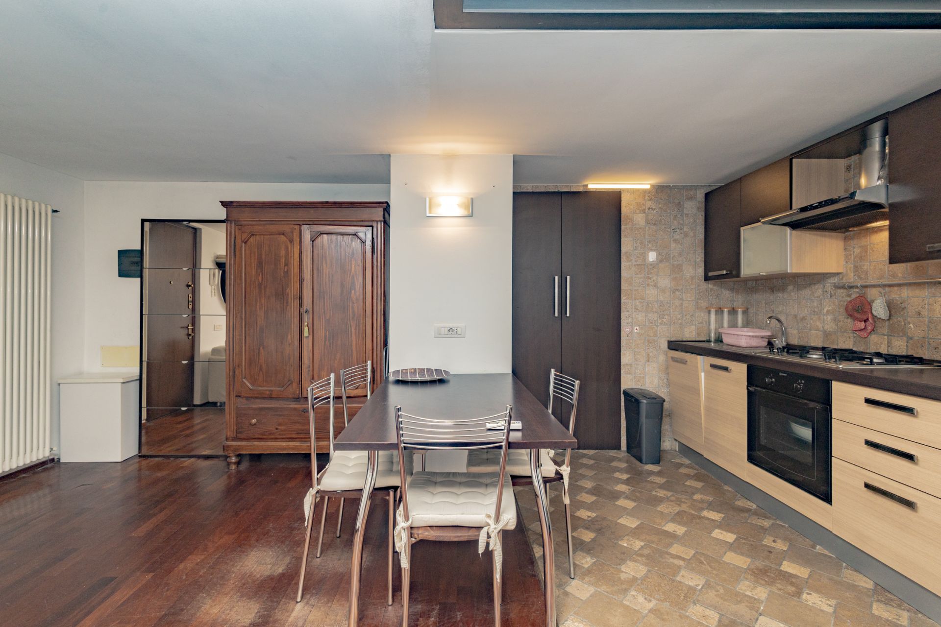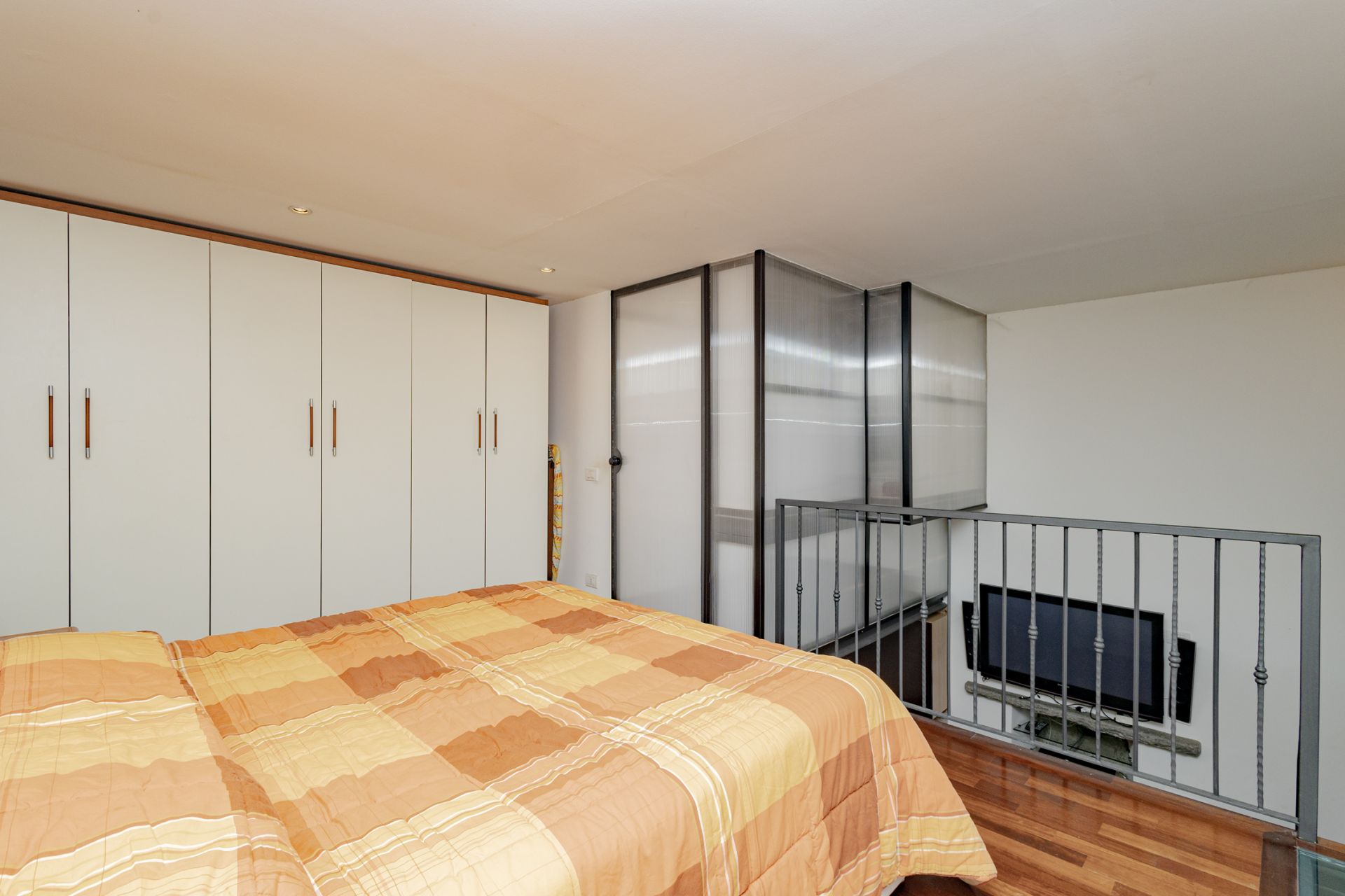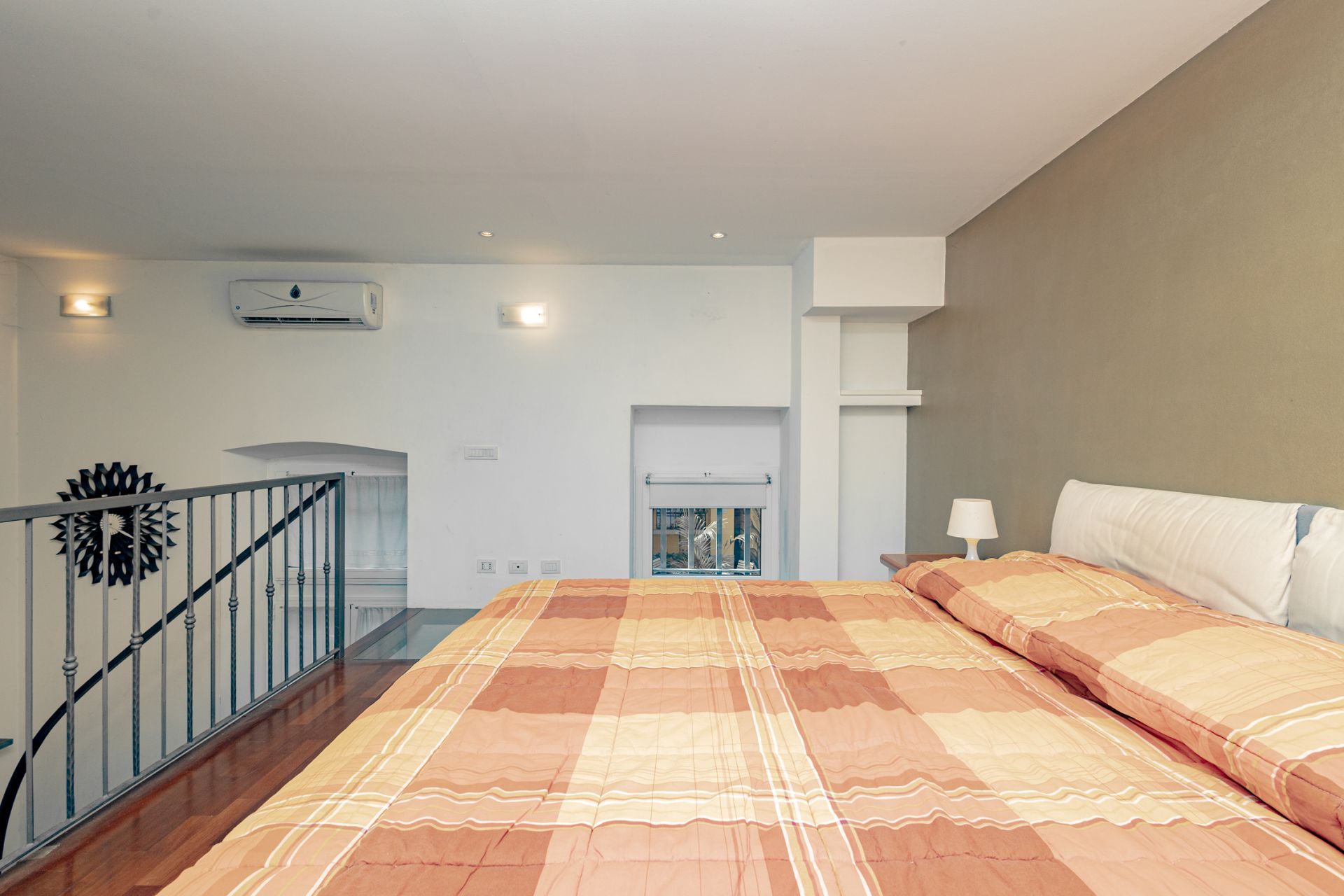 L’ingresso si apre sull’ampio soggiorno con cucina a vista, completamente attrezzata con piano cottura a gas e lavastoviglie. Una scala interna conduce al soppalco, dove sono collocati la camera matrimoniale e il bagno, pensati per sfruttare al meglio l’altezza degli ambienti e creare un’atmosfera intima e caratteristica.