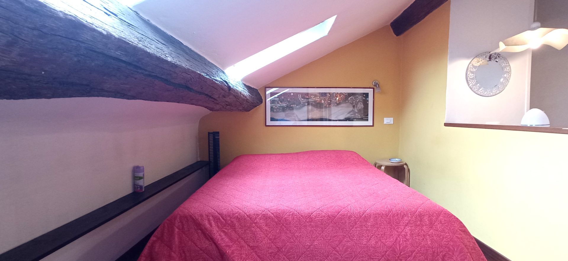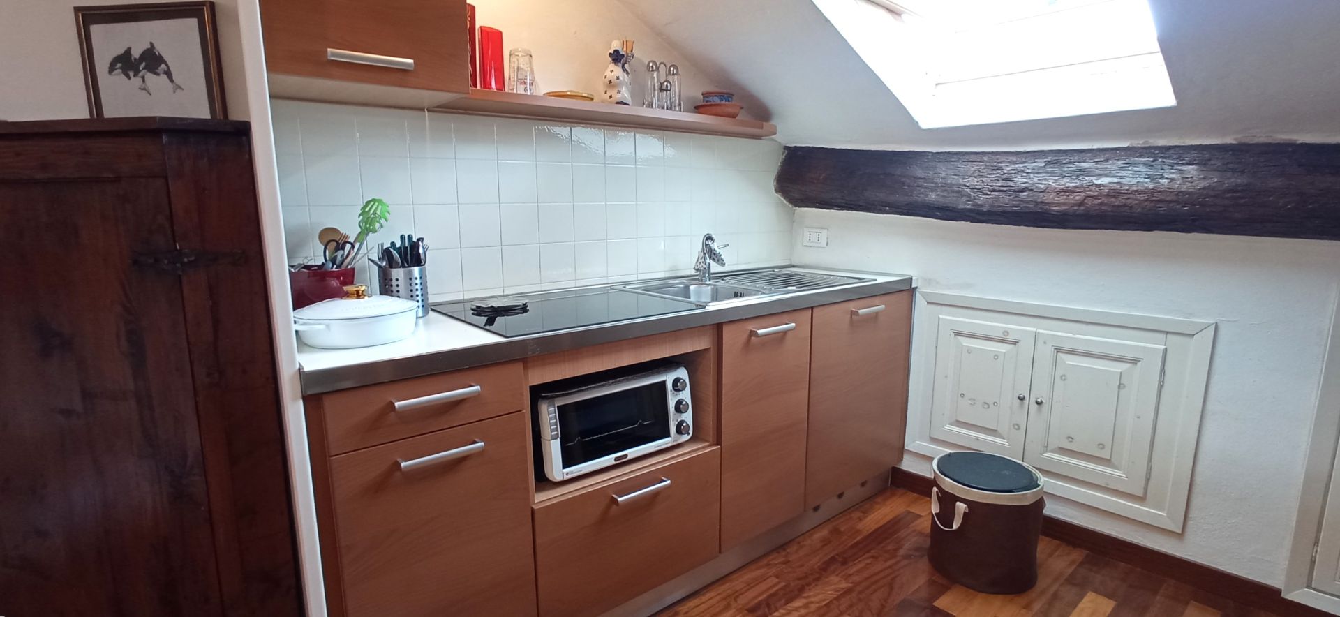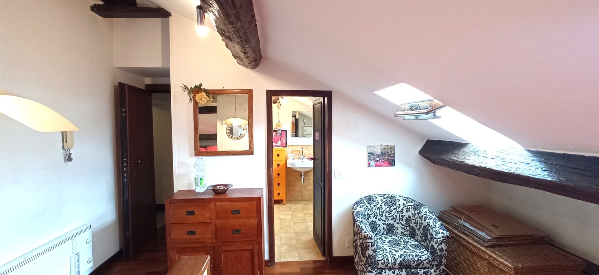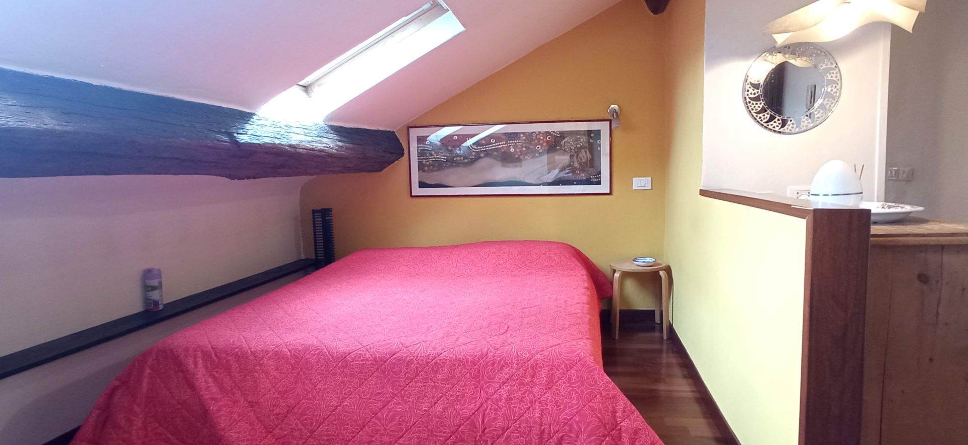 La soluzione è così composta: ingresso, zona notte, bagno e zona giorno. Infissi doppio vetro velux, pavimentazione in parquet.