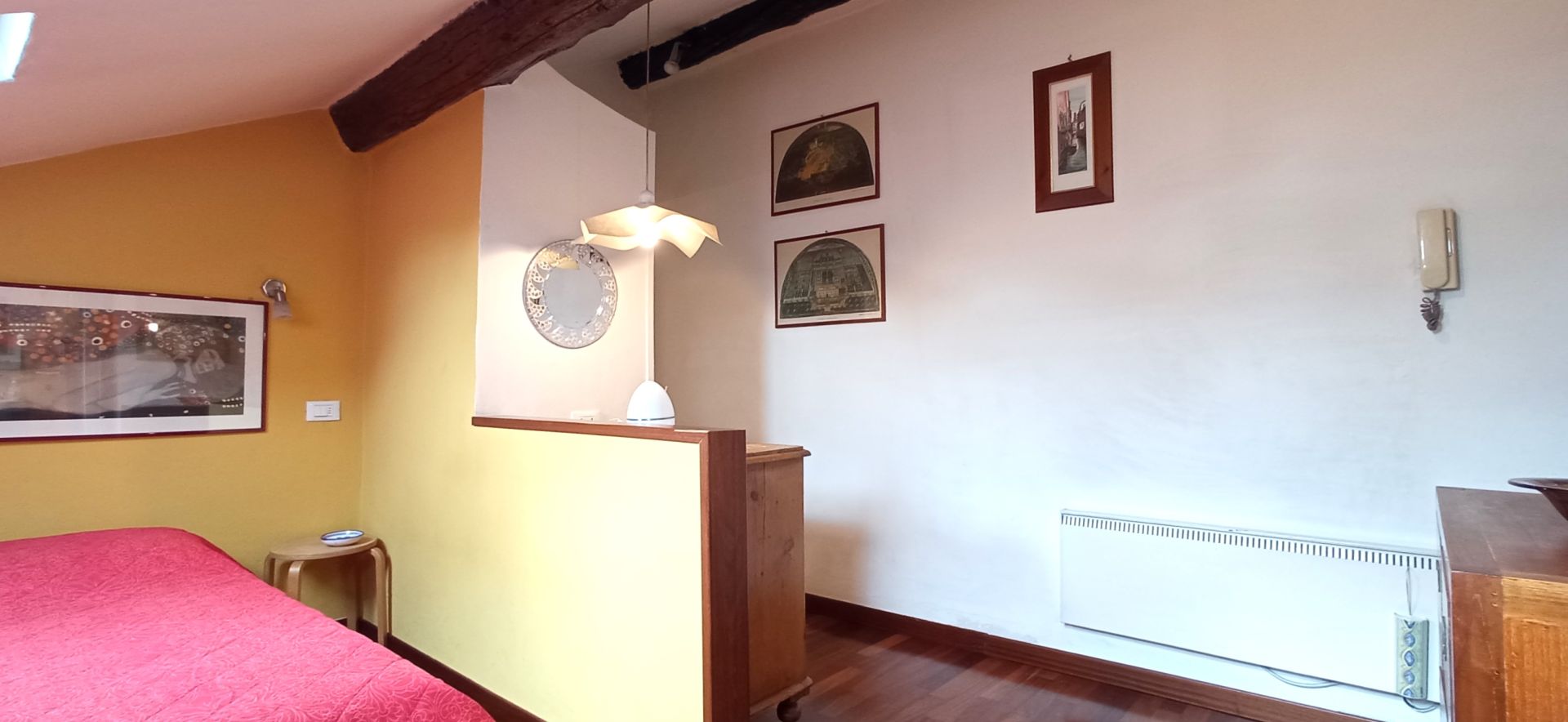 La soluzione è così composta: ingresso, zona notte, bagno e zona giorno. Infissi doppio vetro velux, pavimentazione in parquet.