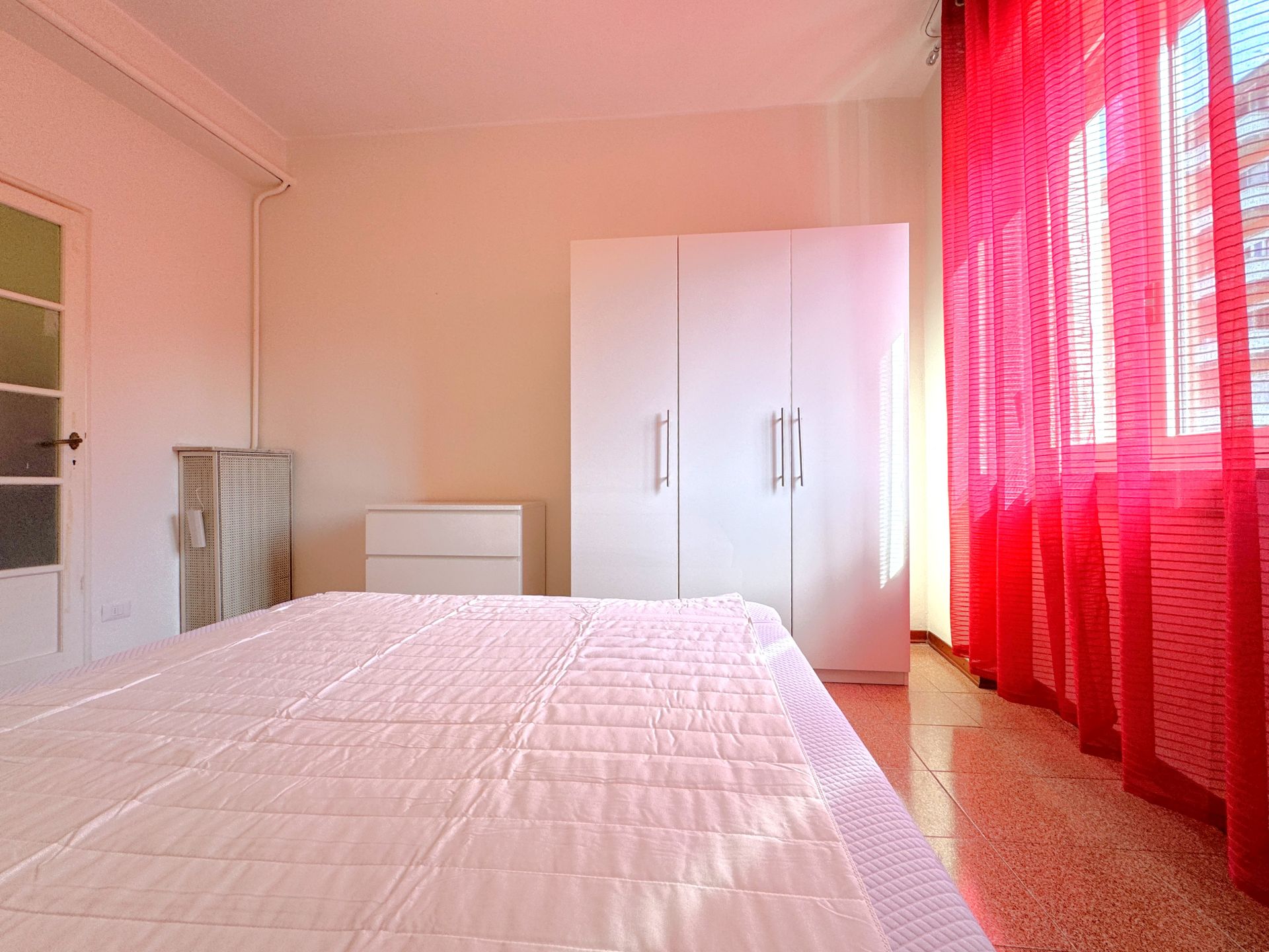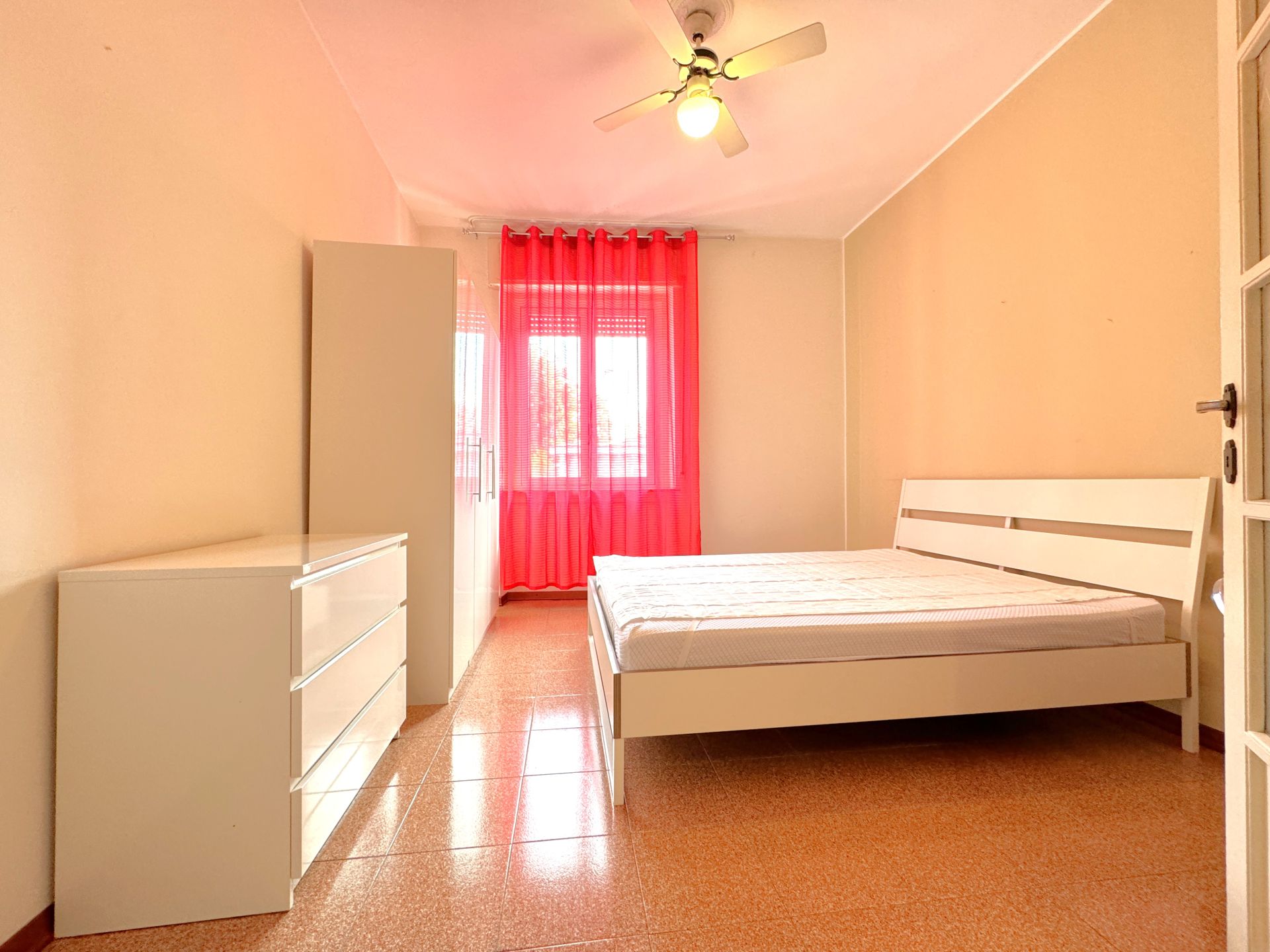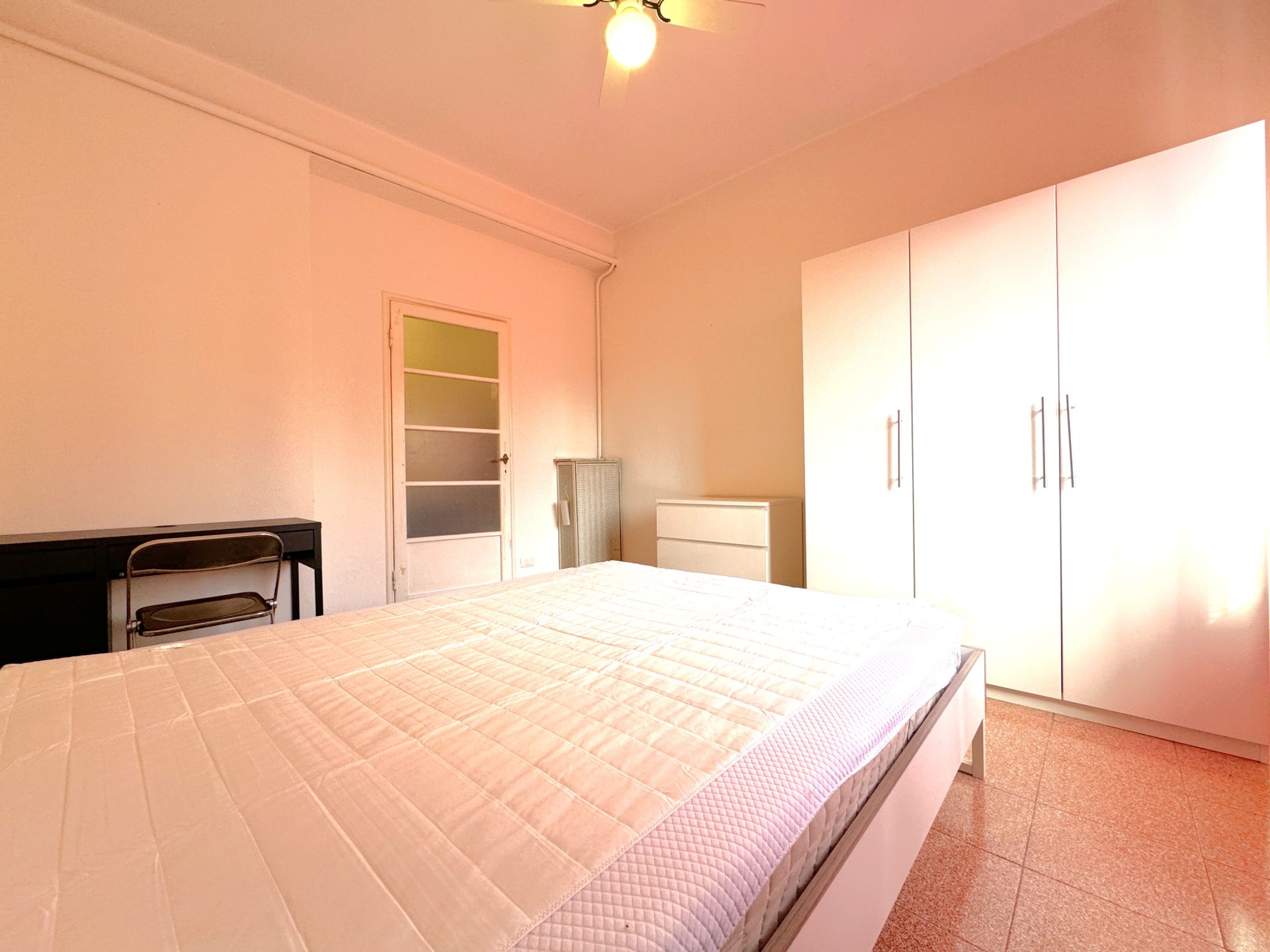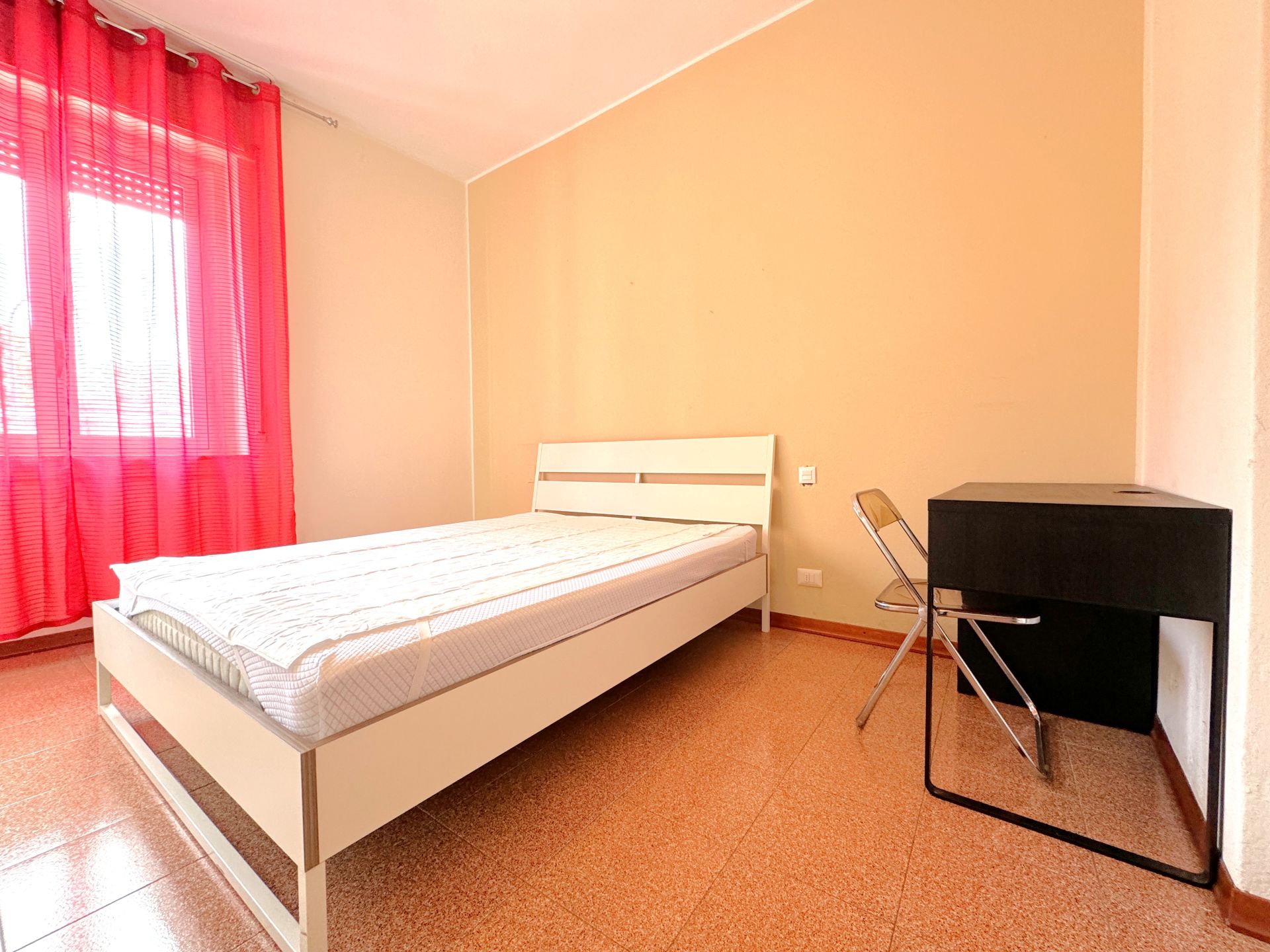 La stanza è inserita all'interno di un appartamento di 100 mq, composto da: ingresso su zona comune con divano, 4 camere, zona pranzo con cucinotto e bagno finestrato con box doccia.