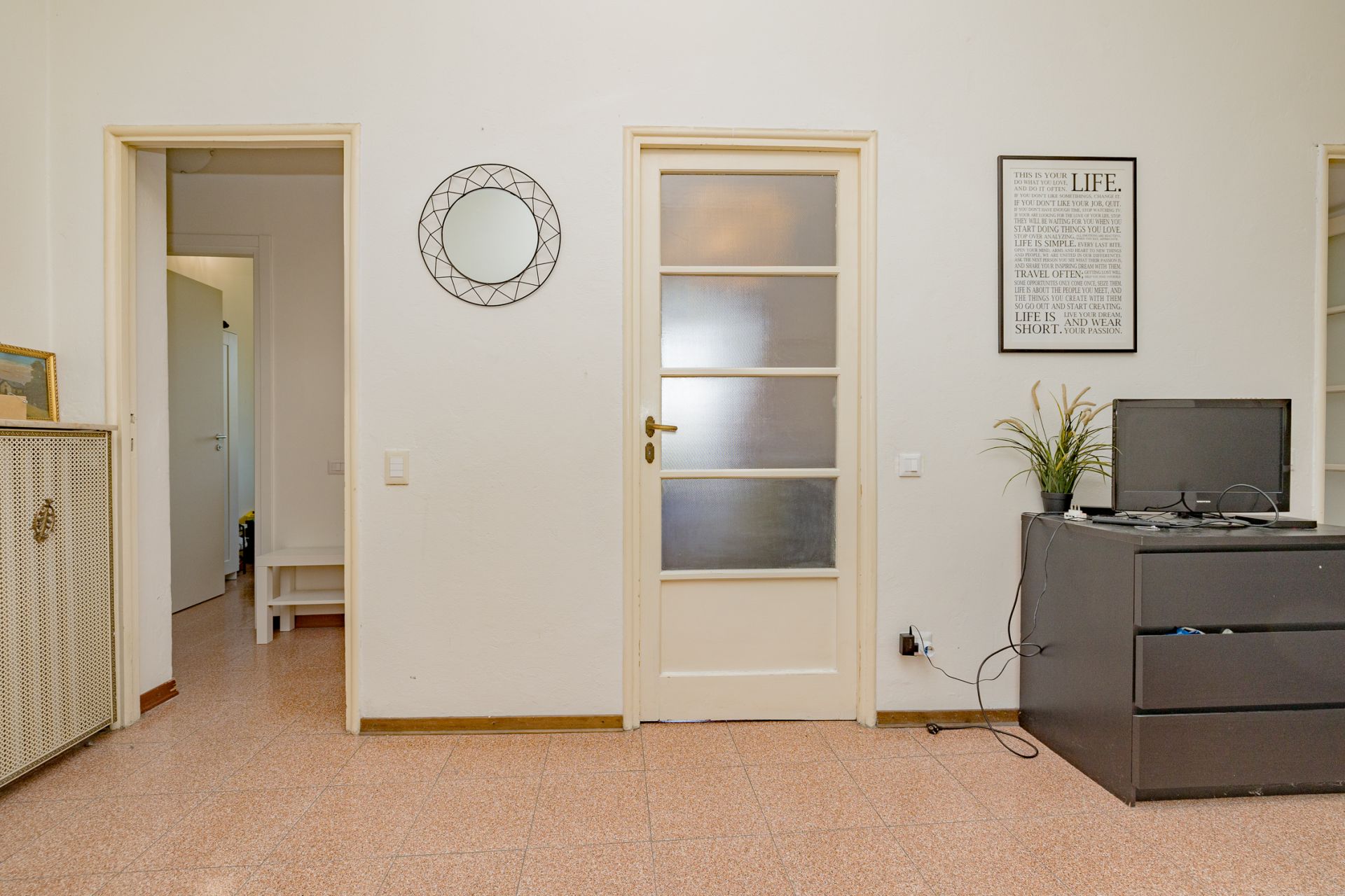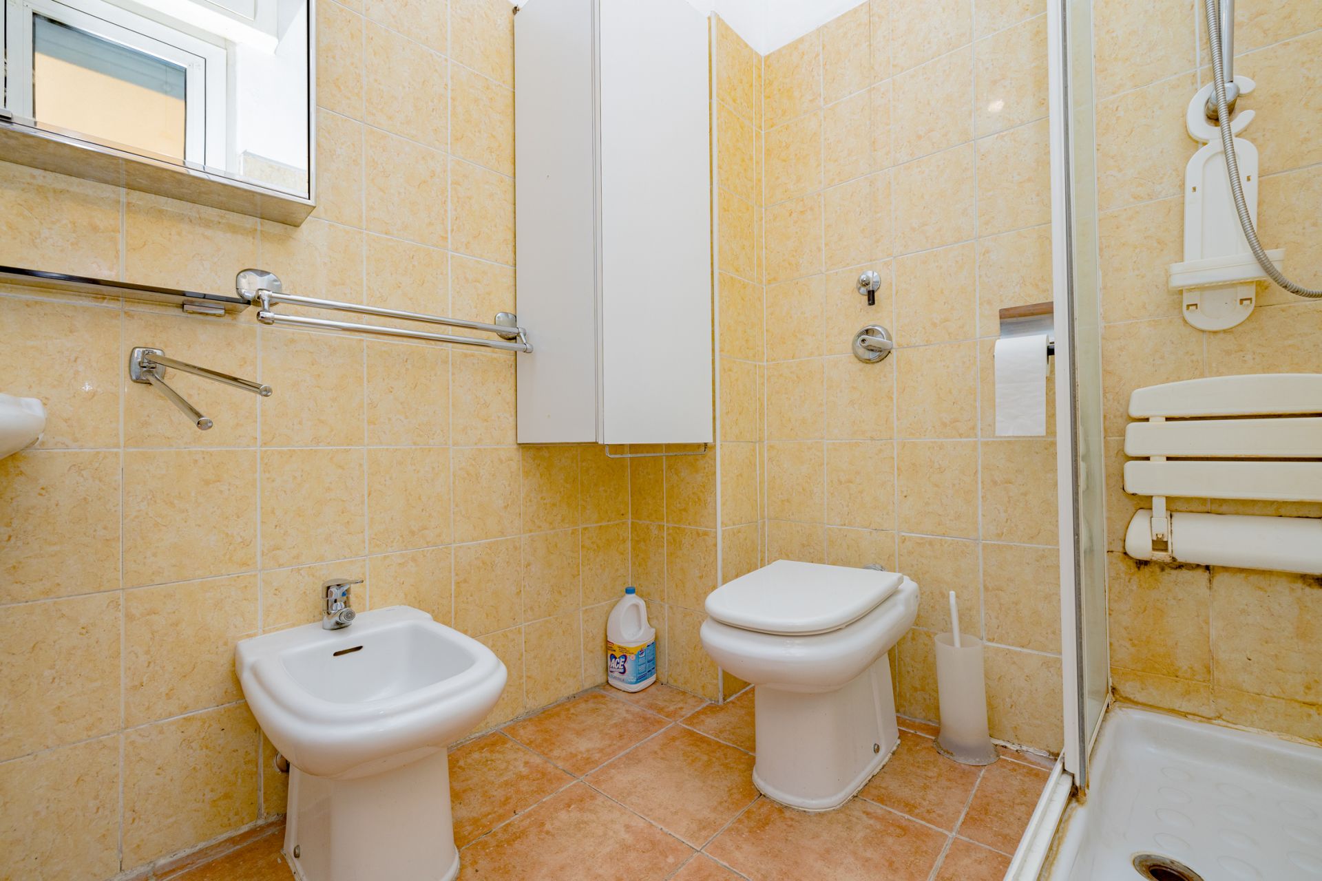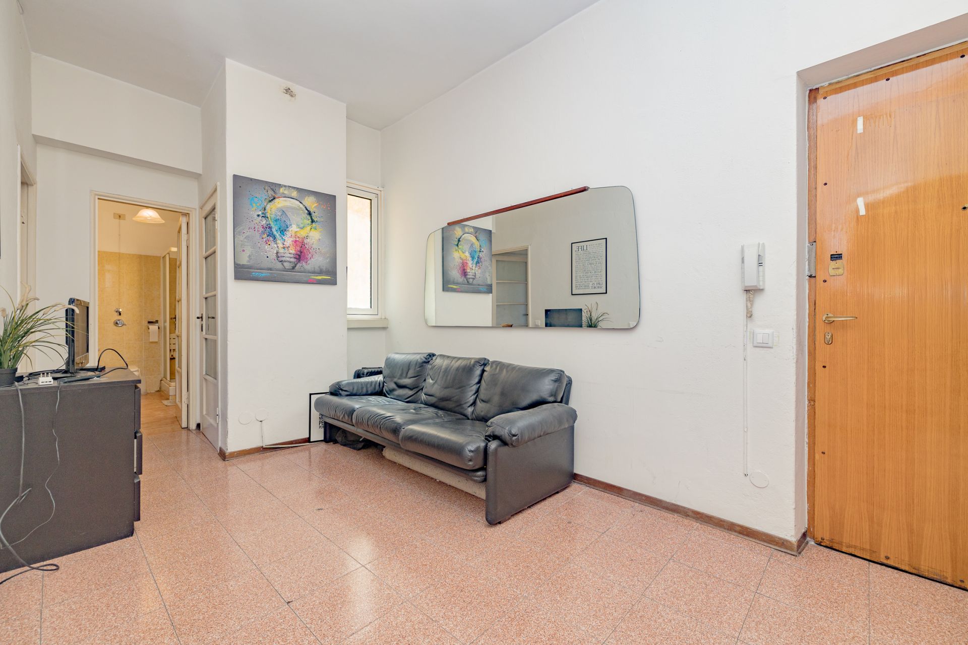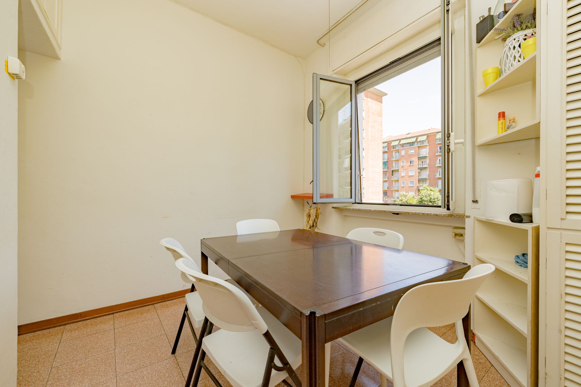 La stanza è inserita all'interno di un appartamento di 100 mq, composto da: ingresso su zona comune con divano, 4 camere, zona pranzo con cucinotto e bagno finestrato con box doccia.
